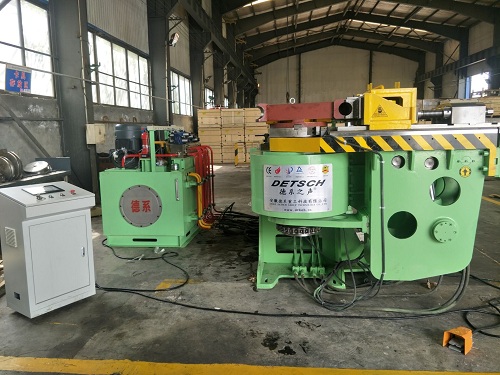 1、將管子(或型材)抱緊在頂鐓機構(gòu)(d)半圓槽(型腔)內(nèi)實現(xiàn)頂鐓工藝。2、為了避免管子(或型材)在彎制≥180度是可能產(chǎn)生的干涉,必須與壓料道軌模(c)動作高度一致。 |
