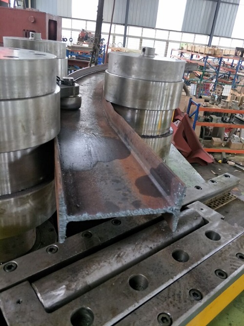 07.回轉(zhuǎn)電動和液壓位移驅(qū)動:一次上料完成,各種型材(角鋼、槽鋼、H型鋼、圓鋼等)端部預(yù)彎和回轉(zhuǎn)彎曲成型,可將各種型材彎曲成所需要的圓形、弧形、螺旋形、橢圓形等預(yù)定曲率工件。