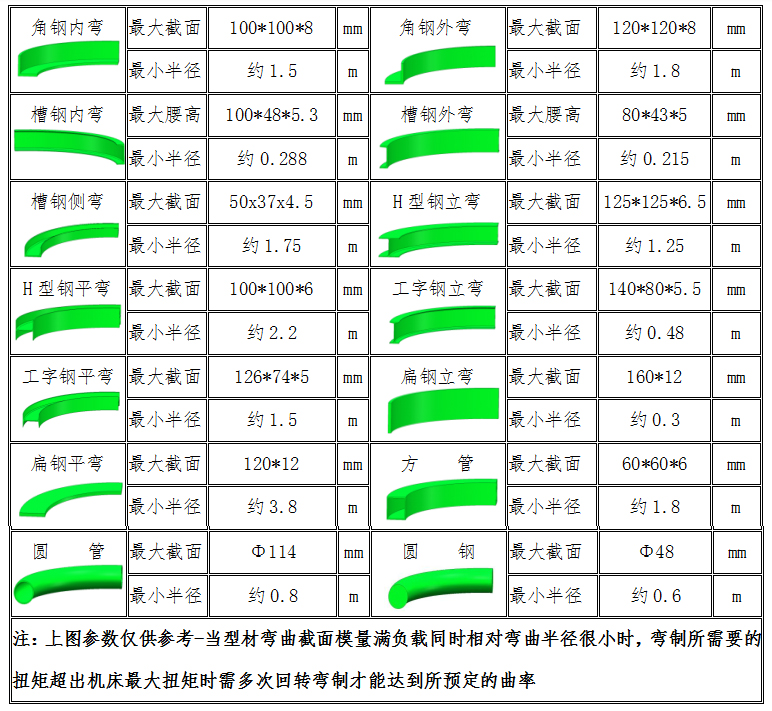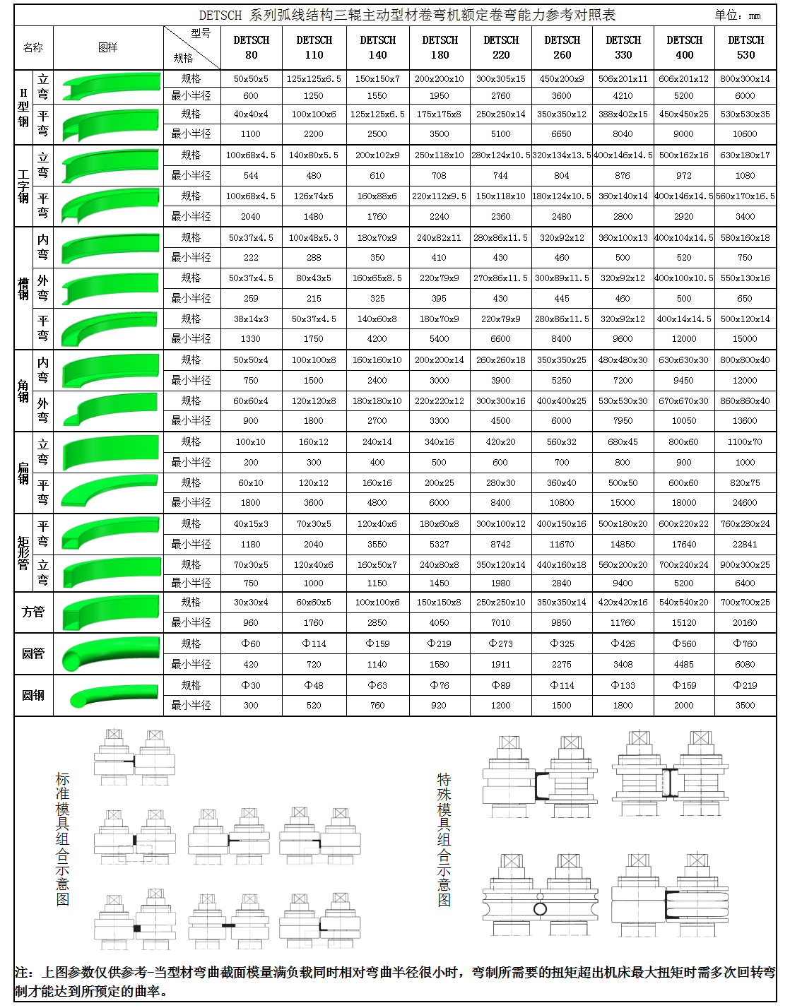 六、 DETSCH CNC數(shù)控弧線結(jié)構(gòu)三輥主動型材卷彎機型材彎曲參照表