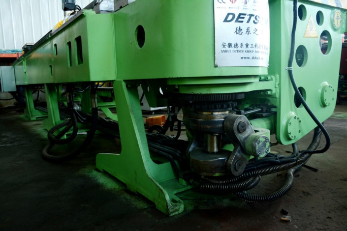 1、將管子(或型材)抱緊在頂鐓機構(d)半圓槽(型腔)內實現(xiàn)頂鐓工藝。2、為了避免管子(或型材)在彎制≥180度是可能產生的干涉,必須與壓料道軌模(c)動作高度一致。 |